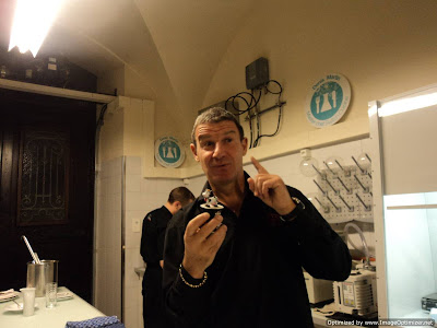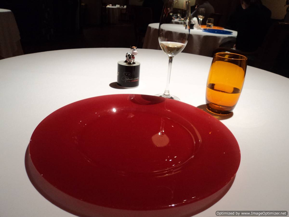 Depois disse-nos que outra coisa a que dava muita importância também era ao ambiente em que as refeições decorriam. Que se a um grupo de pessoas fosse dado um saucisson com pão e um copo de vinho, o ambiente e a atitude era bem diferente do que se lhes fosse dado um sauternes com foie-gras. Que normalmente as pessoas vão para um restaurante com 2 estrelas Michelin, com uma atitude "mais séria" e que ele gostava de um ambiente descontraído. Que isso era importante para ele. Que um dia tinha reparado que nos restaurantes se põem muitas vezes na mesa umas flores e as pessoas nem se conseguem ver bem... Ele é muito expressivo a falar, de modo que as histórias que foi contando e a forma como o fazia, deram origem a momentos muito divertidos. Acabou por nos perguntar se tinhamos reparado o que estava em cima das mesas: